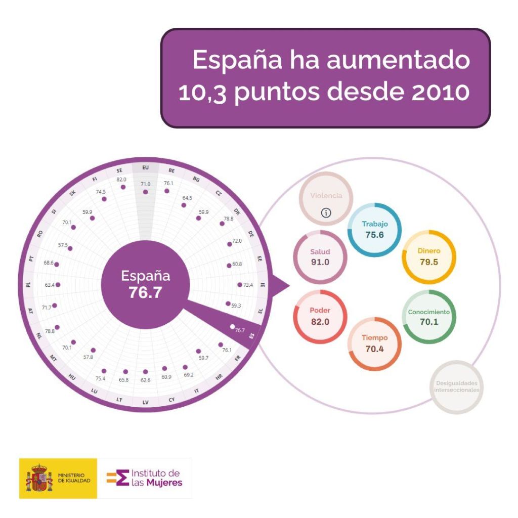 En su informe, el EIGE destaca a España como uno de los países que más avanza en la materia en los seis indicadores analizados: trabajo, dinero, conocimiento, tiempo, poder y salud. Sólo Suecia, Dinamarca y Países Bajos superan a España en la clasificación general y se sitúa junto a Alemania, Luxemburgo y Austria, profundizando la brecha estadística entre los mejor y peor clasificados del ranking europeo.