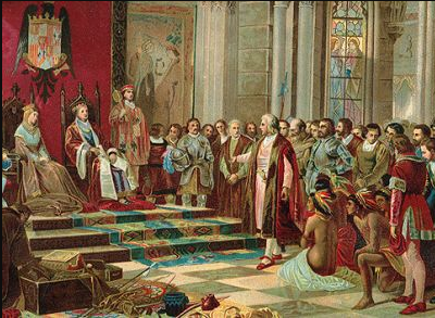 *El regreso de Cristóbal Colón a Barcelona, donde fue recibido por los Reyes Católicos tras su primer viaje al Nuevo Mundo, ha sido representado en diversas obras, como el cuadro del pintor Ricardo Balaca (1844–1880). Colón se había propuesto establecer un sistema de esclavización de los pueblos indígenas americanos, pero la reina Isabel la Católica se opuso y, en su lugar, decidió reconocer a los indígenas como súbditos de la Corona de Castilla, dando lugar a una serie de leyes destinadas a su protección. Esta política culminaría décadas más tarde con la promulgación de las Leyes Nuevas de 1542, que buscaban limitar los abusos del sistema de encomiendas y defender los derechos de los pueblos originarios de las Américas.